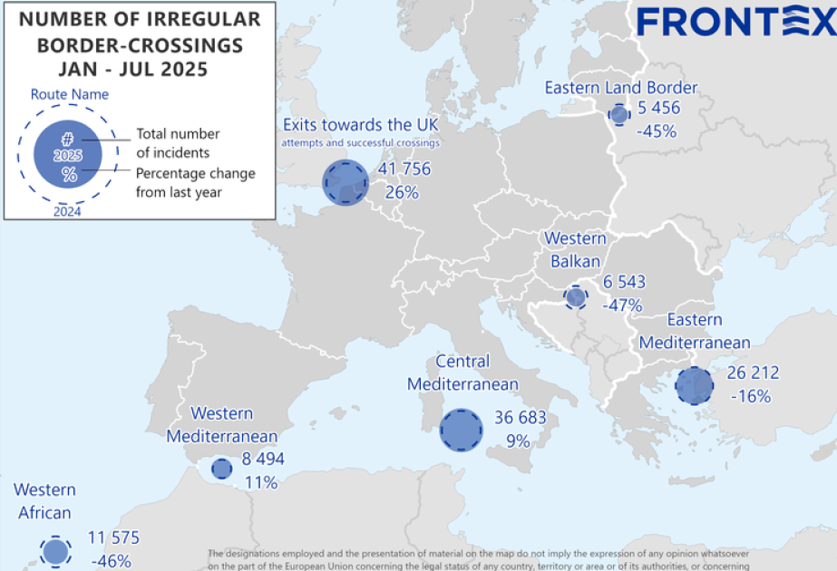 Avropa Sərhəd və Sahil Mühafizəsi Agentliyinin (“Frontex”) ilkin məlumatlarına görə, 2025-ci ilin ilk yeddi ayında Avropa İttifaqına qeyri-müntəzəm sərhəd keçidləri 18 faiz azalaraq 95 200-ə düşüb.