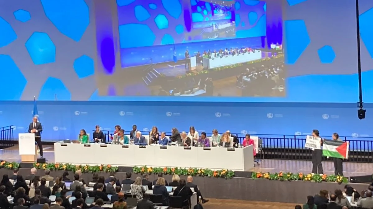 Səhnəyə Fələstin bayrağını qaldıran etirazçılar, “Soyqırım davam edərkən hər şeyə olduğu kimi davam edə bilməzsiniz” deyərək reaksiyalarını bildiriblər. İsrailin hücumları altında Fələstin torpaqlarında baş verənlərə qarşı səslərini ucaldan etirazçılar bu dəfə Birləşmiş Millətlər Təşkilatının (BMT) İqlim Konfransında səhnəyə çıxıblar.