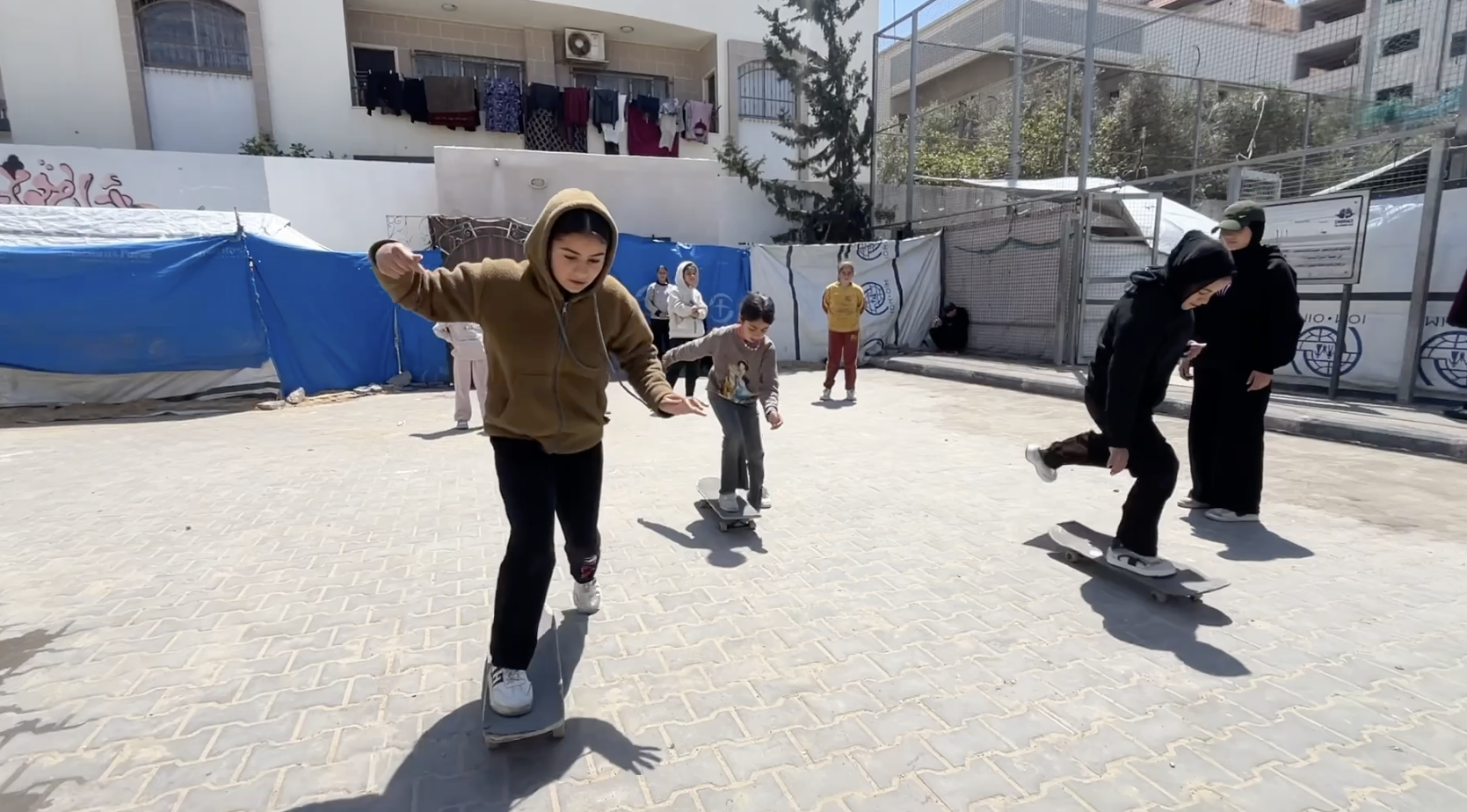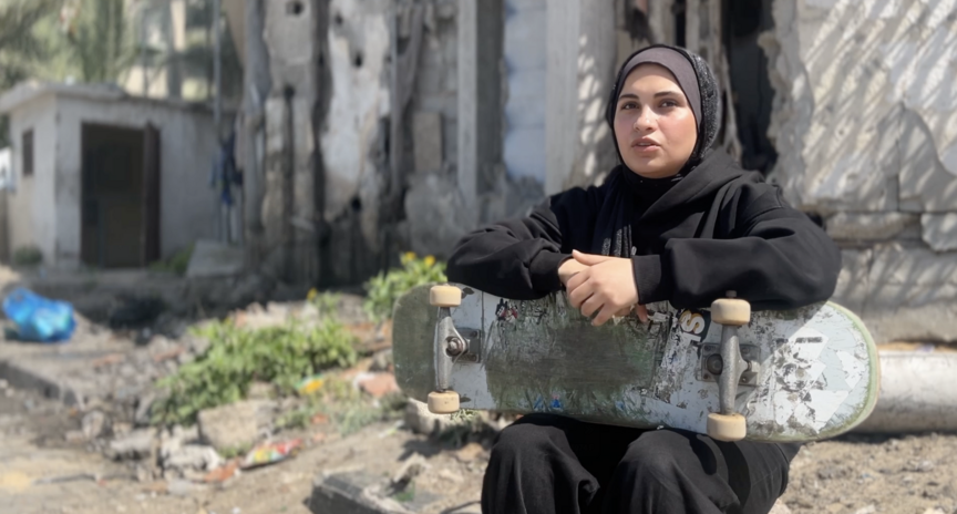 Qəzza zolağında İsrail hücumlarının davam etdiyi ağır humanitar şəraitdə 16 yaşlı Rimas Dellul adlı gənc qız skeytbordla (kaykay) idmanı ilə həm özünə, həm də ətrafındakı uşaqlara ümid aşılayır.